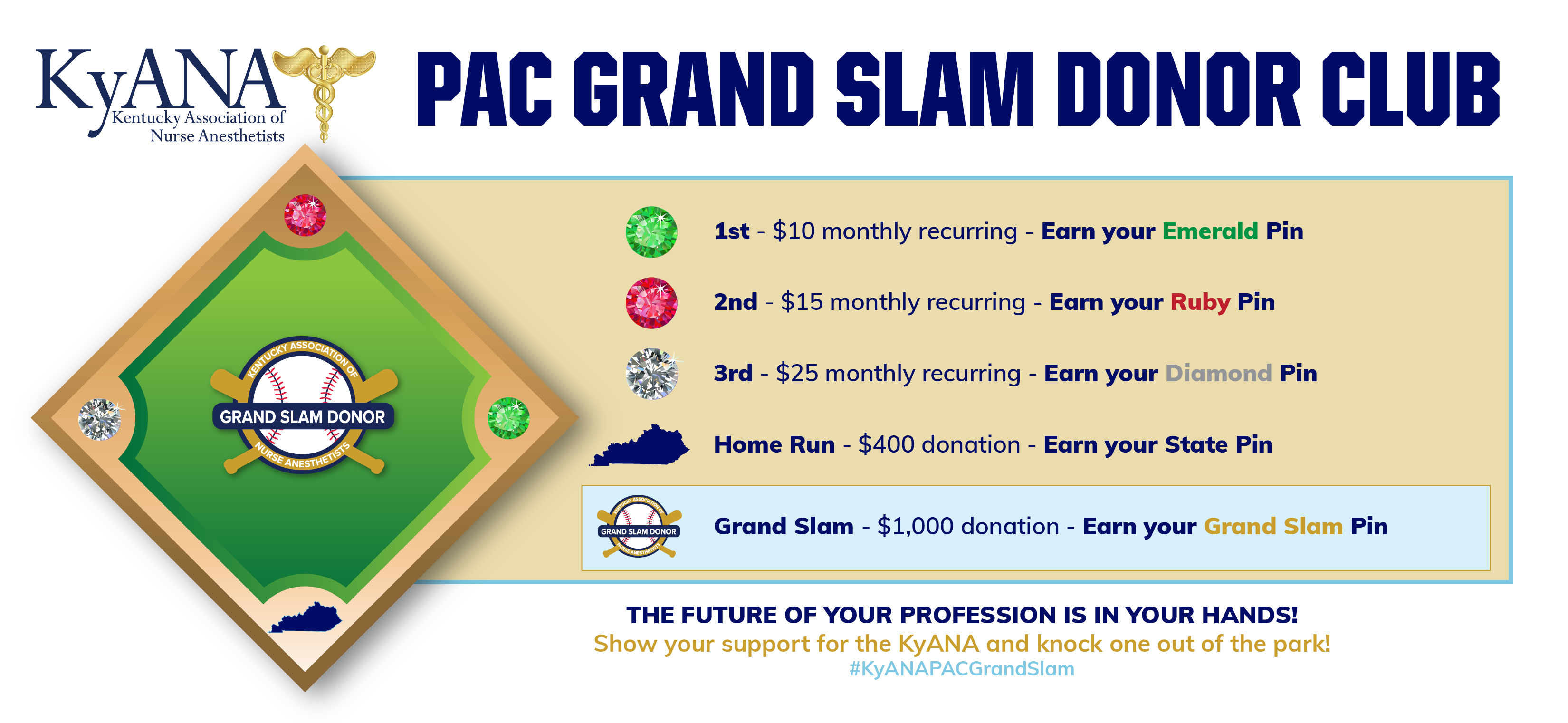Join us in championing the voice of CRNAs and securing a brighter future for the profession. Together, let's hit a grand slam and proudly showcase your commitment with the exclusive Grand Slam Lapel Pin!